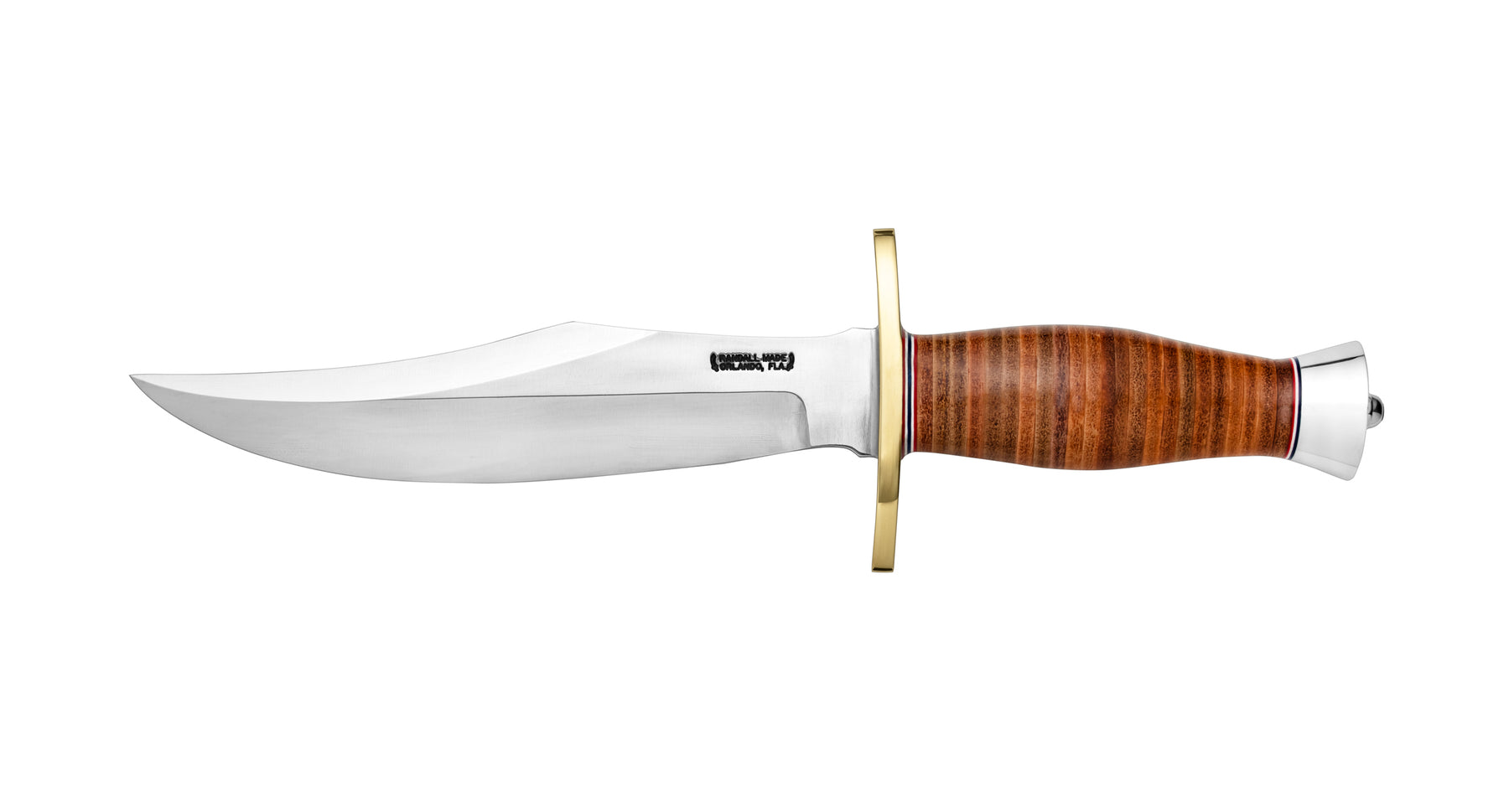 8" blade of 1/4" stock. 1 5/8" wide. The top cutting edge is sharpened approximately 5 ¼”. Brass double forward curved hilt. Approximately 5" leather handle. Duralumin butt cap. Designed on special order for a big game sportsman who planned to use it for hunting. Upon request, available in stainless steel. (wt. 14-16 oz.) Supplied with Model A sheath.