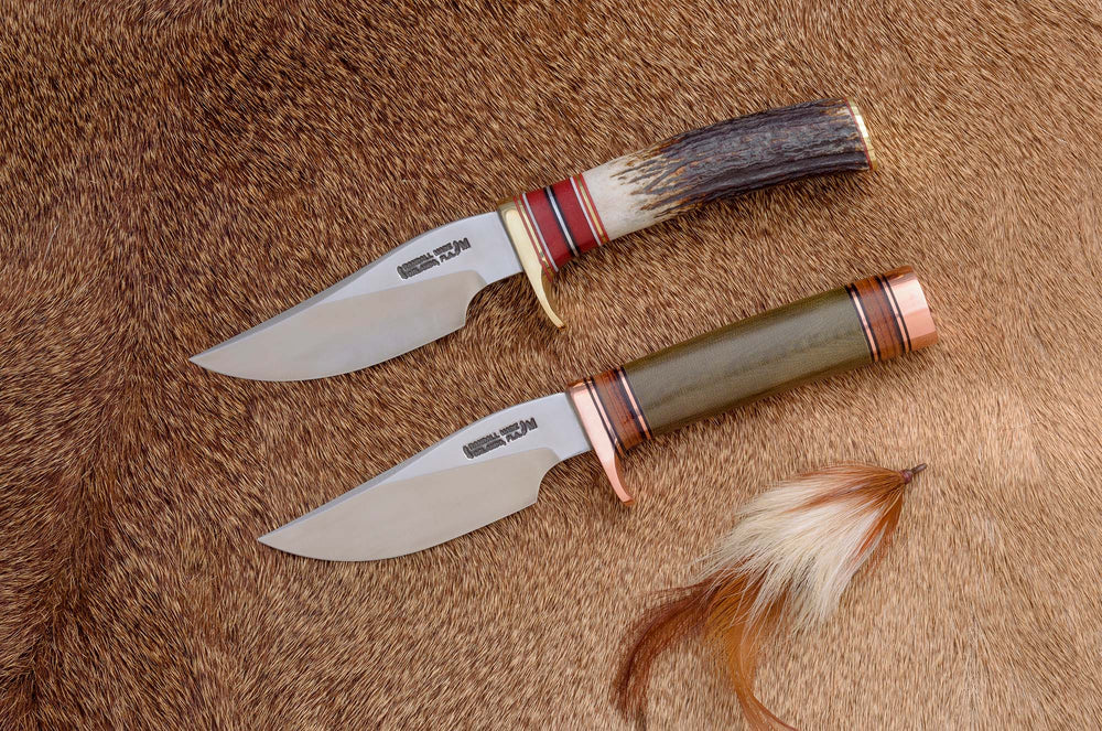 3 1/2" blade of 3/16" stainless steel stock. Brass single hilt. Approximately 3 3/8" stag handle. Configured with the Model #27 Trailblazer handle. Please specify brass or nickel silver hilt options. Etching is available on the blade. Mini knives are sold as shown. Supplied with a mini sheath.